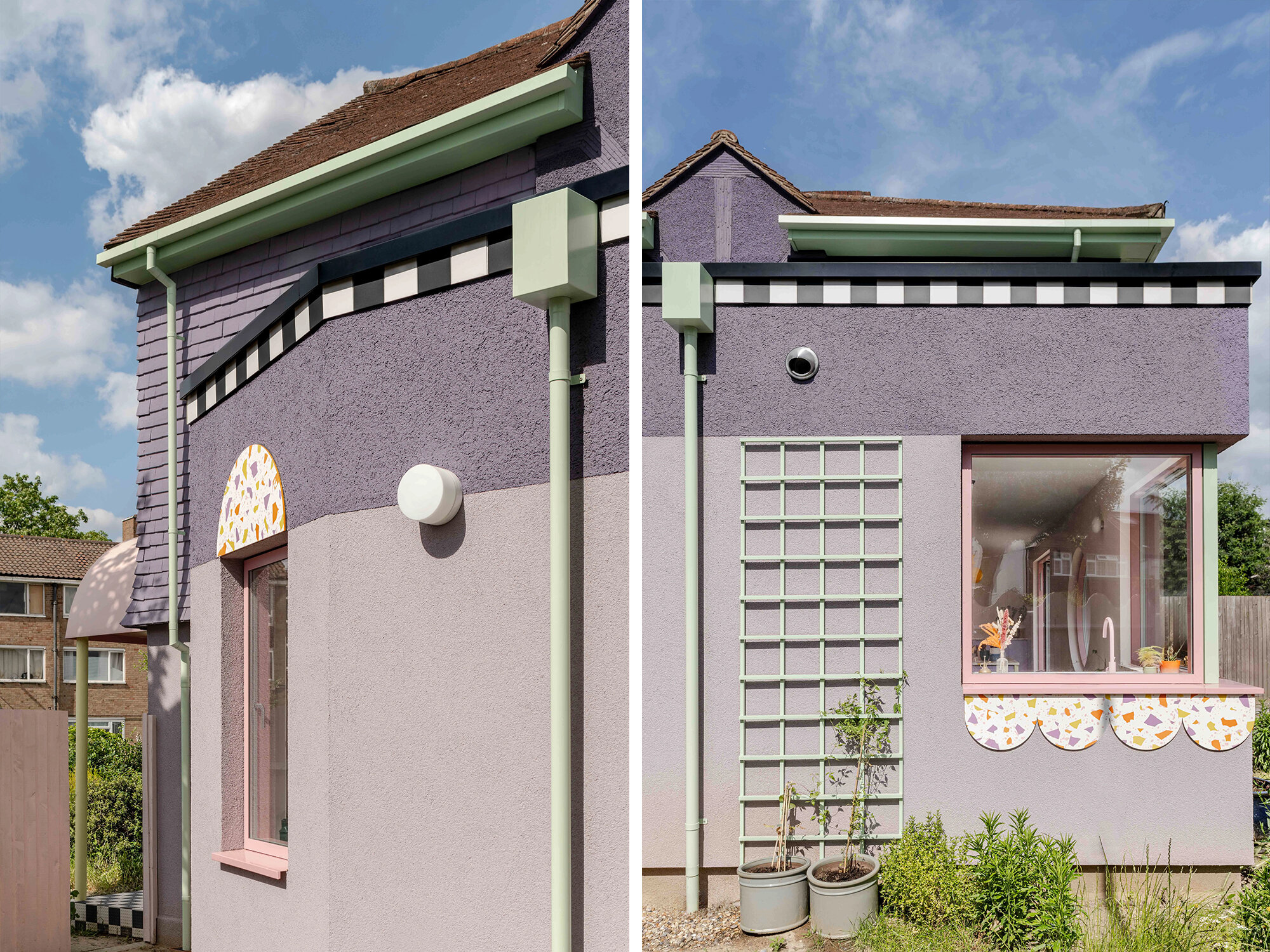 Лиловый оттенок фасада напоминает кондитерскую глазурь, водосточные трубы обрели приятный мятный цвет, а полукруглый козырёк, водрузившийся на тонкие жёлтые колонны, выкрашен в розовый. Вместе эта разнообразная палитра задаёт мягкое, но игривое настроение.