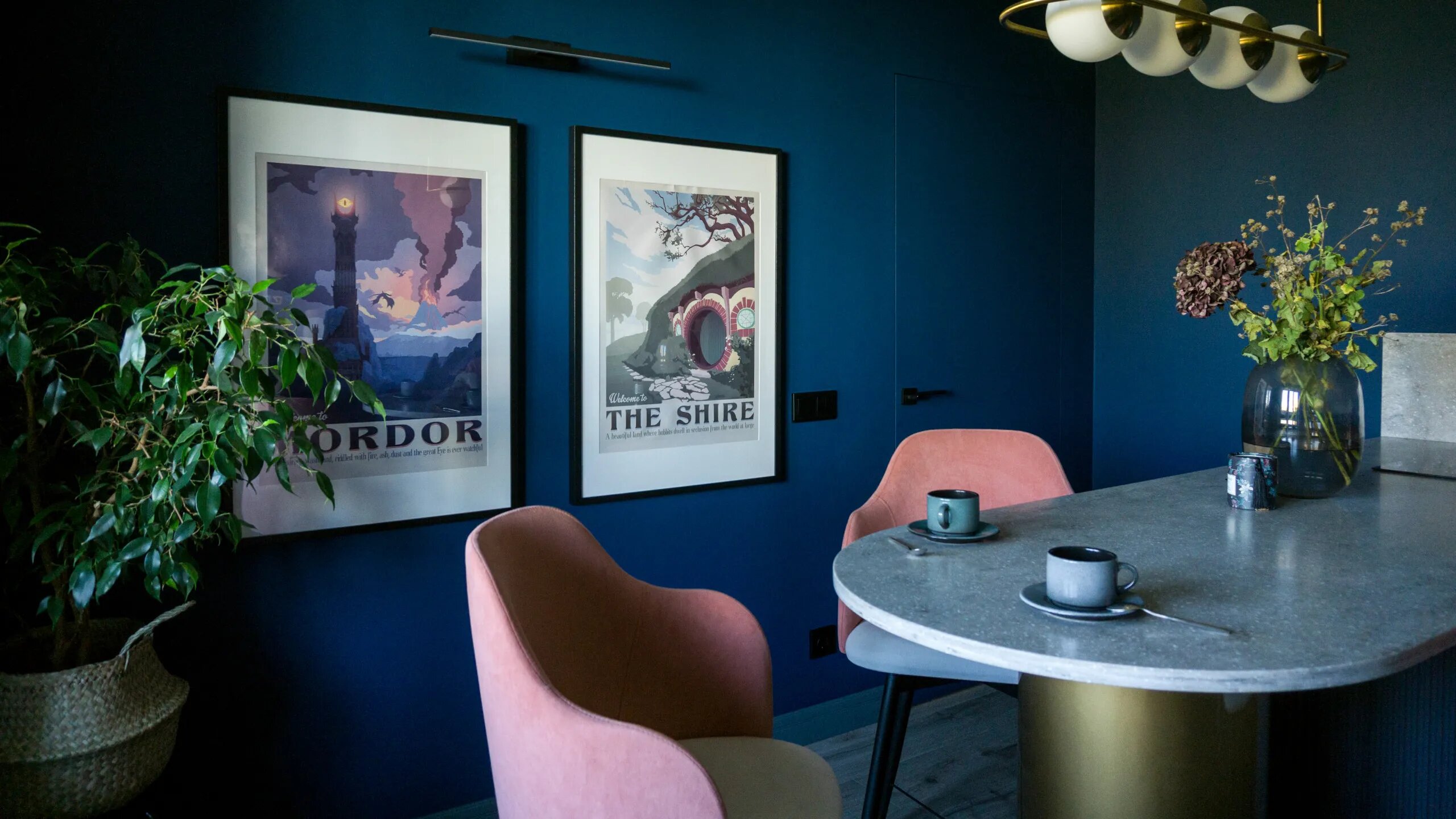 Кухня выполнена в глубоком синем оттенке, столешница-стойка и подвесная люстра блестят золотом, а металлическую серость шкафчиков разбавляет гранитная текстура фартука. Особое очарование кроется в настенных плакатах с персональной подсветкой.