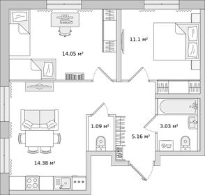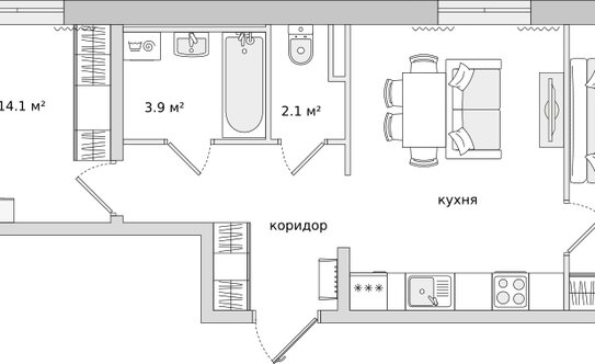 - 2-комнатные квартиры: раздельный санузел, кухня-гостиная, кабинет, спальня;