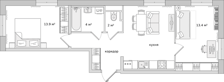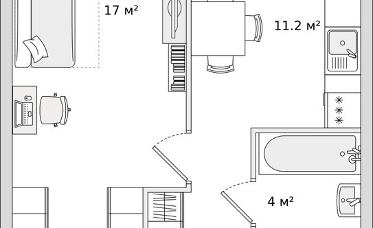 - 1-комнатные квартиры: совмещённый санузел с ванной, кухня-гостиная, спальня, лоджия;