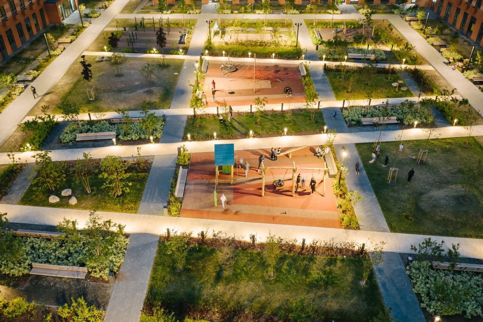 Внутренние дворы разделены на зоны отдыха, игровые и спортивные площадки. Между ними проложены широкие прогулочные аллеи. На первых этажах работают супермаркеты, кафе, салоны красоты, а также два отделения платной поликлиники и центр художественной гимнастики.
